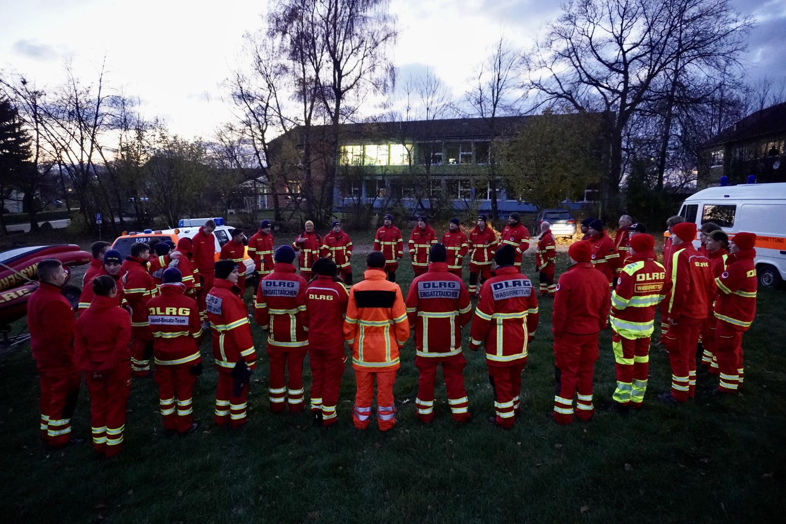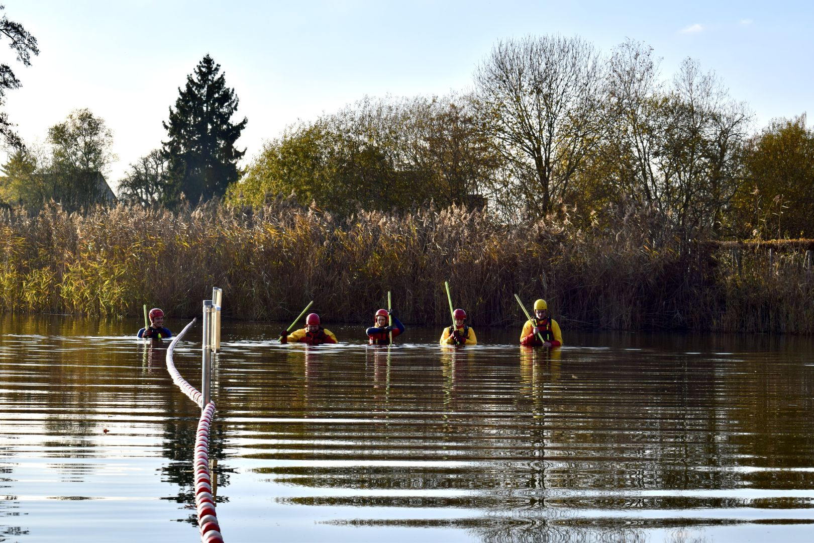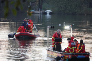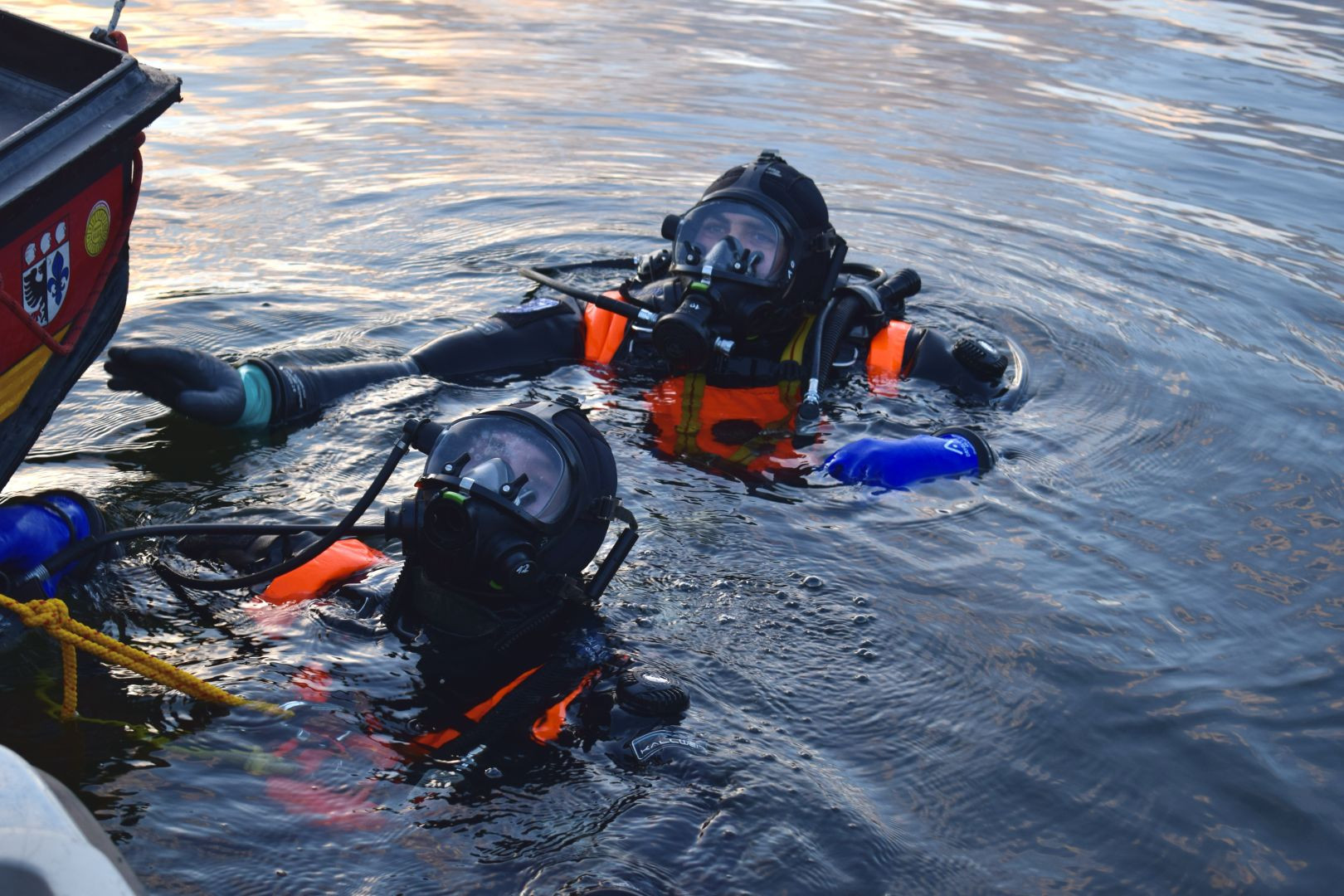 Am Einsatzort angekommen, zeigte sich schnell, dass die Lage noch komplexer war – insgesamt wurden drei Personen vermisst. Die Strömungsretter machten sich sofort einsatzklar und suchten das Ufer zu Fuß sowie mit Suchstangen im Flachwasserbereich ab. Eine Drohne unterstützte die Suche aus der Luft, während die Einsatztaucher das Gewässer in verschiedenen Suchmustern absuchten. Zunächst vom Ufer aus, später auch vom Boot. Das Sonarboot kam ebenfalls zum Einsatz und markierte auffällige Stellen, die anschließend von den Tauchtrupps überprüft wurden. Nach und nach konnten alle Vermissten gefunden werden. Eine Person wurde von einem Taucher in der Nähe des Sprungturms entdeckt, eine weitere wurde von den Strömungsrettern im Schilfgürtel geborgen und gegen Ende wurde auch die letzte Person von Tauchern gefunden und aus dem Wasser geholt.