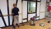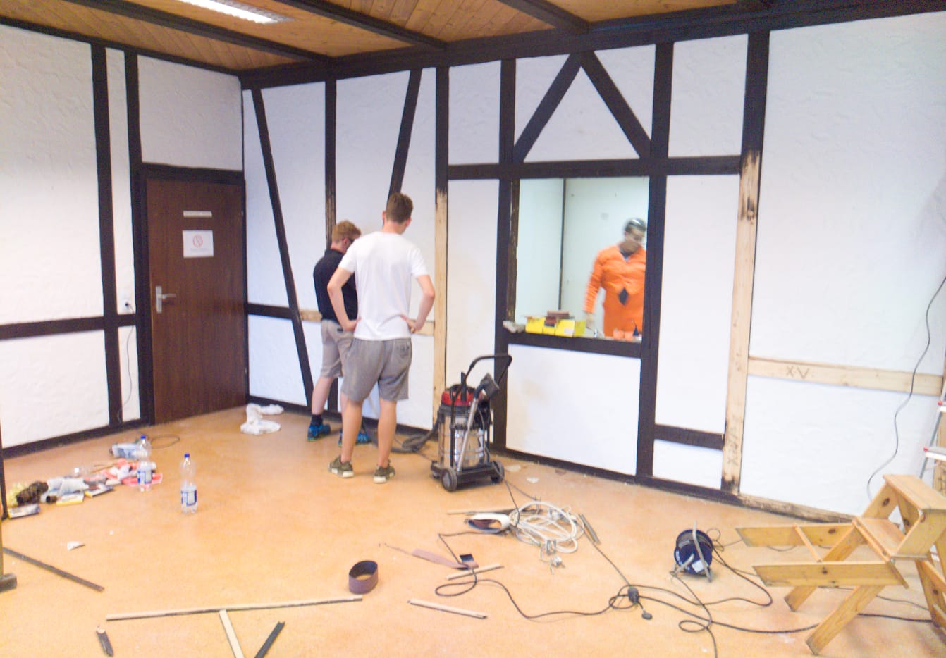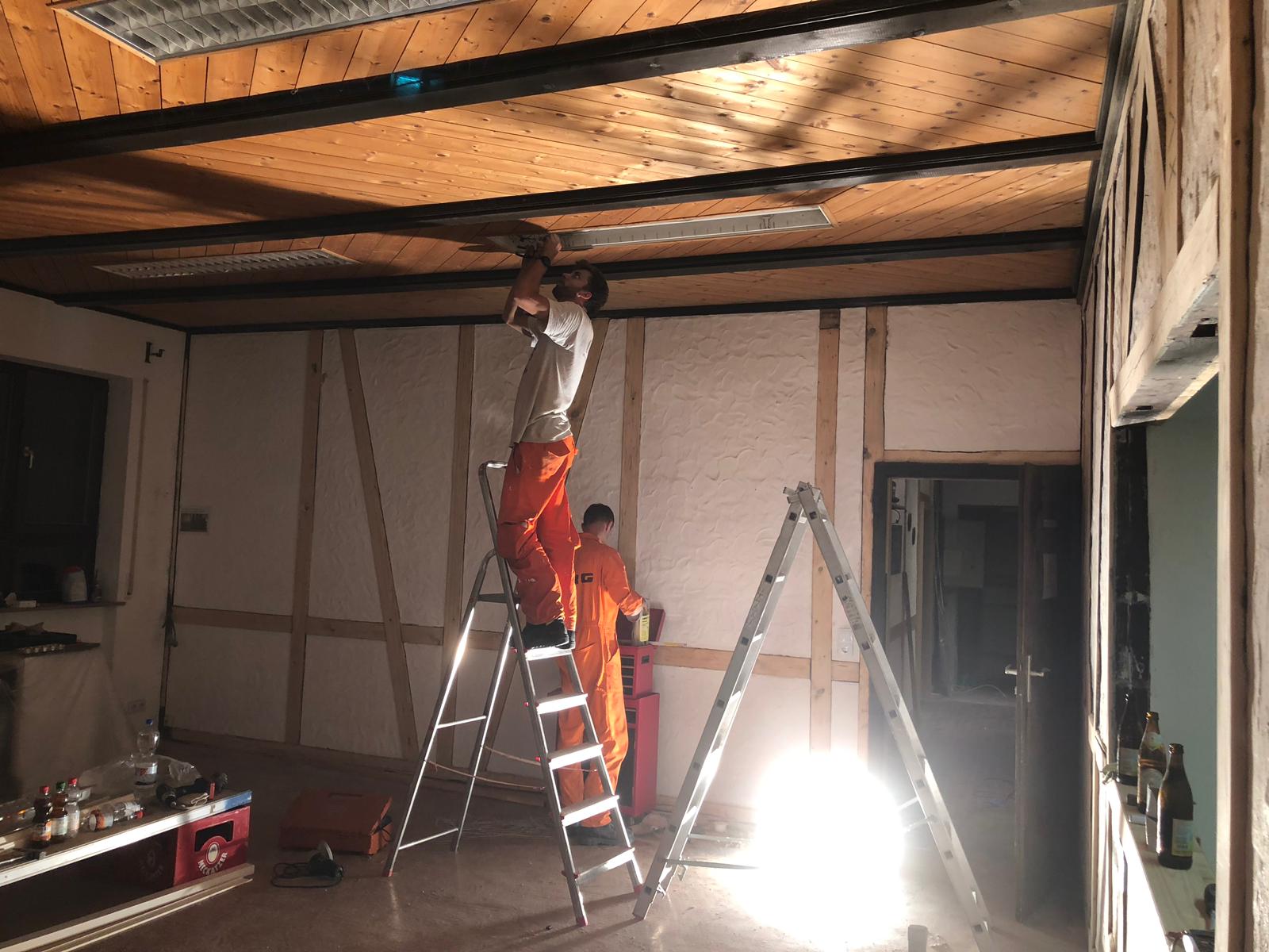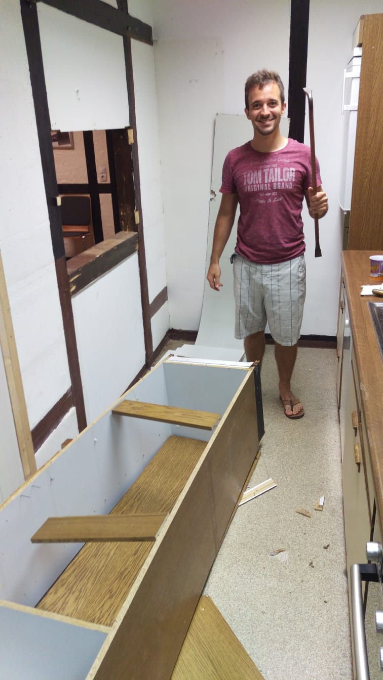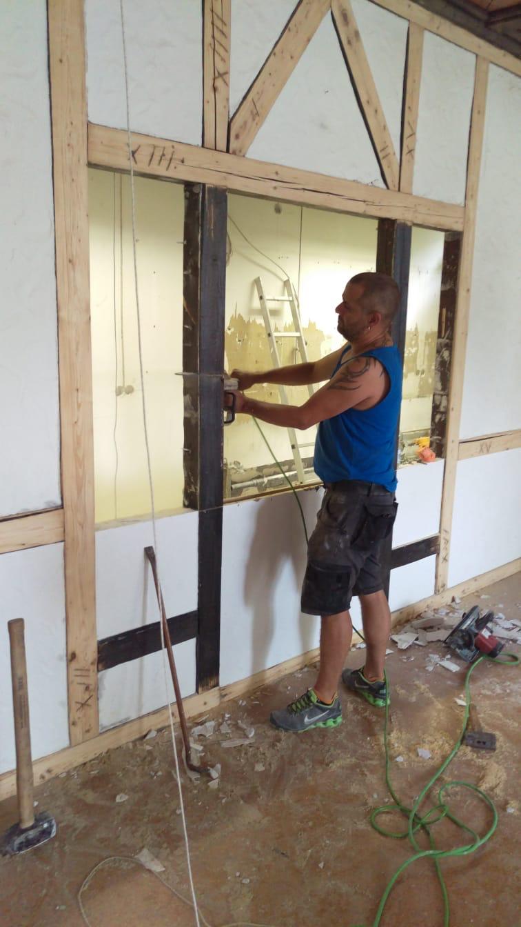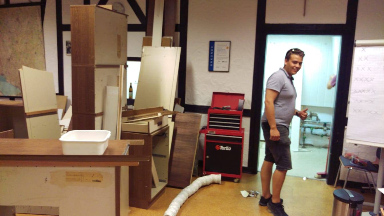 Ende Juli 2019, nach dem Rutenfest, beginnen nun die Baumaßnahmen. Unter der Leitung von Benedikt Musiol, der die Planung der Küche akribisch vorbereitet hat und die Baumaßnahmen nun überwacht, wurde zunächst die alte Küche entfernt und entsorgt, um dann den gesamten Raum zu entkernen und die Balken des Fachwerks im Lehrsaal abzuschleifen.