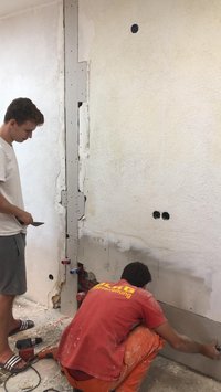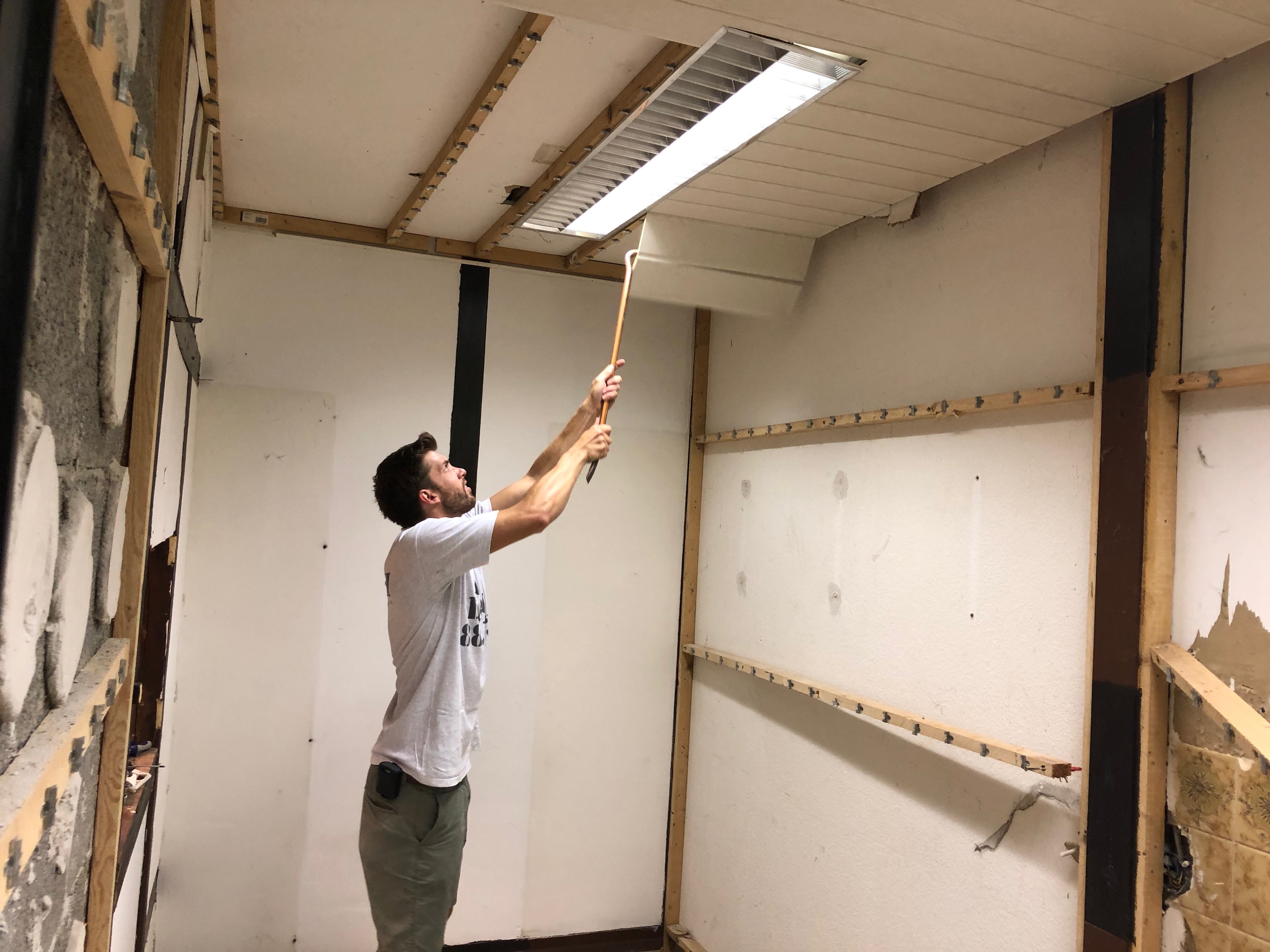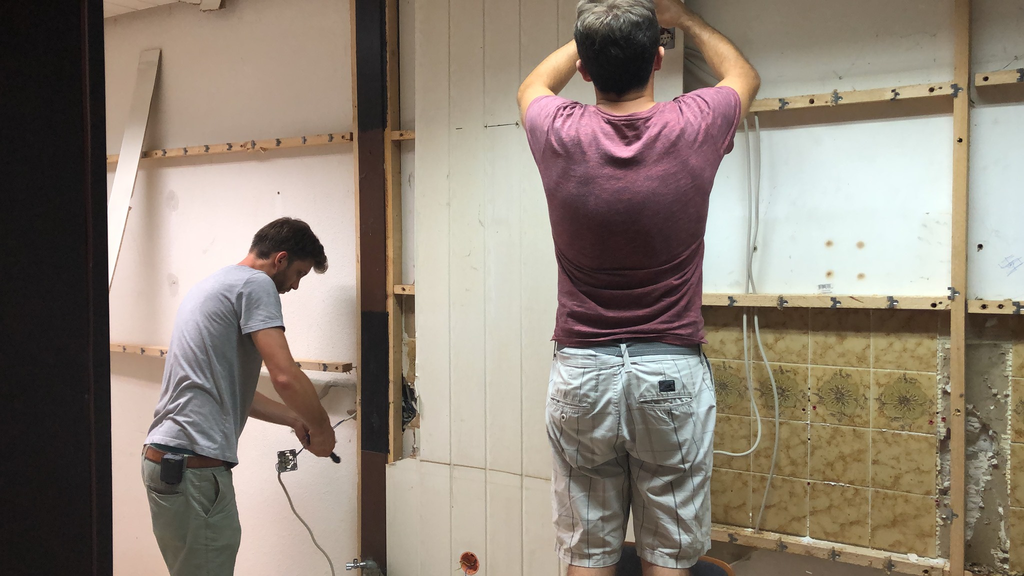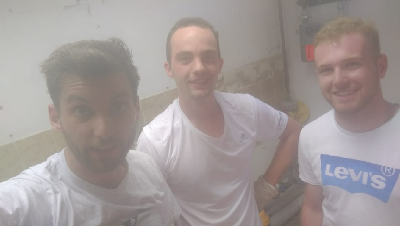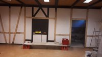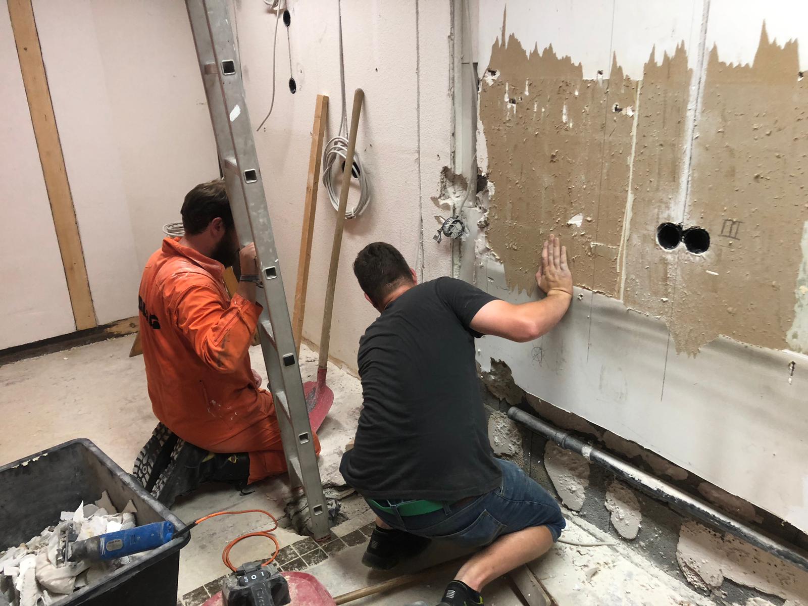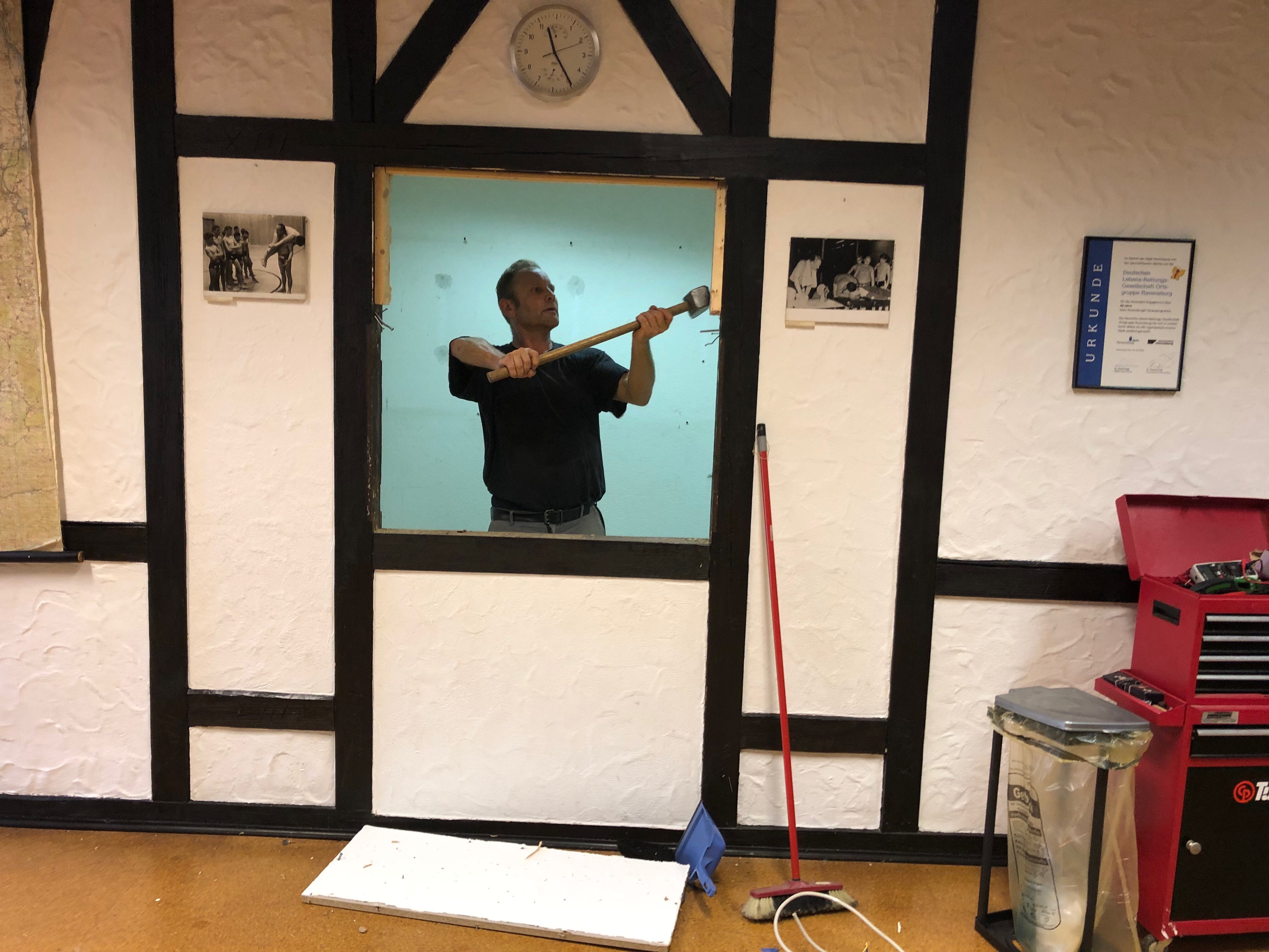 Ende Juli 2019, nach dem Rutenfest, beginnen nun die Baumaßnahmen. Unter der Leitung von Benedikt Musiol, der die Planung der Küche akribisch vorbereitet hat und die Baumaßnahmen nun überwacht, wurde zunächst die alte Küche entfernt und entsorgt, um dann den gesamten Raum zu entkernen und die Balken des Fachwerks im Lehrsaal abzuschleifen.